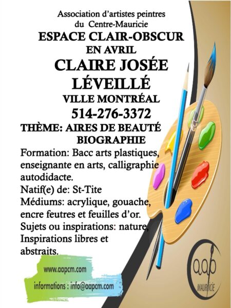 ESPACE CLAIR-OBSCUR : À L’HONNEUR DU 6 AVRIL au 3 MAI = CLAIRE JOSÉE LÉVEILLÉ de Montréal